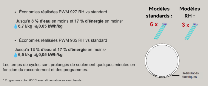 Le fabricant a également élaboré des modèles spéciaux « RH » à chauffage électrique réduit, c’est-à-dire possédant 3 résistances électriques au lieu de 6 dans les modèles standards. Ils sont spécialement conçus pour les établissements disposants d’une puissance électrique limitée ou sensibles à la réduction de la consommation d’eau et d’énergie.