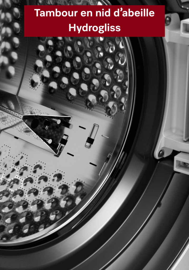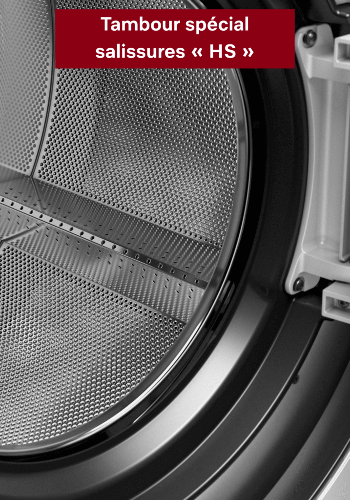 Chacun pourra choisir, le fabricant proposant deux versions de tambours : celui désormais bien connu en nid d’abeilles Hydrogliss breveté Miele, qui offre une meilleure évacuation de la saleté, une humidification plus efficace et une qualité du linge préservée. Ou le tambour spécial salissures « HS » pour le traitement du linge présentant une proportion élevée de salissures (poils d’animaux, etc.) grâce à sa surface perforée.