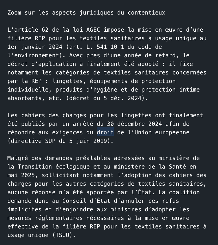 Une coalition inédite d’associations de collectivités et d’ONG* s’est formée pour enjoindre l’État d’appliquer la loi AGEC. Cette loi votée en 2020 prévoyait l’application du principe « pollueur-payeur » aux fabricants de nombre de textiles sanitaires à usage unique (TSUU), dont les EPI et autres linges plats jetables.